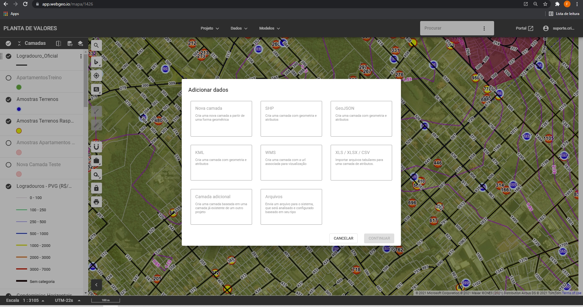 Importar arquivos do tipo shapefile, kml, geojson, dxf e wms