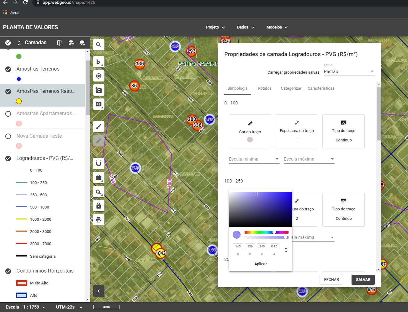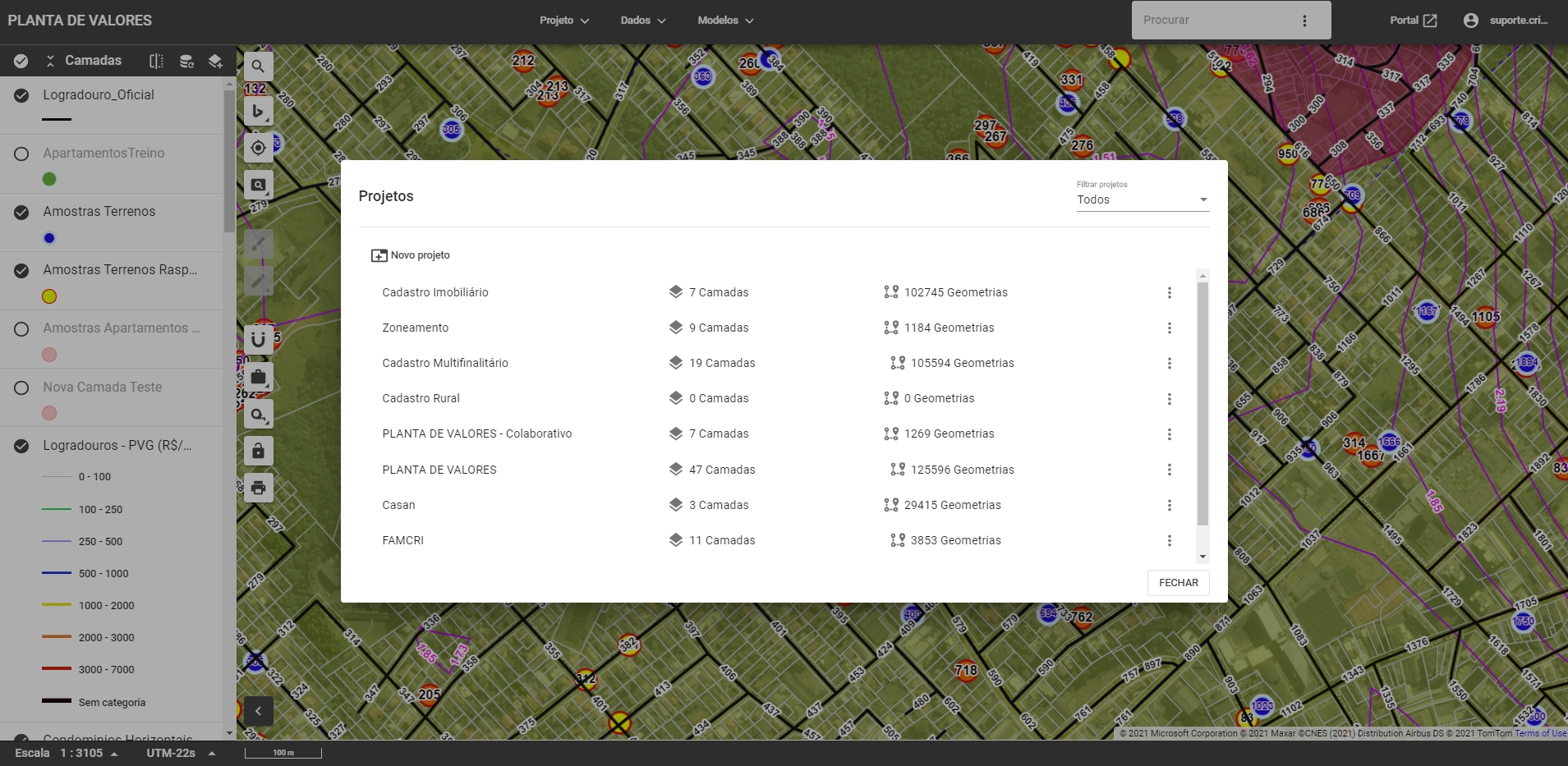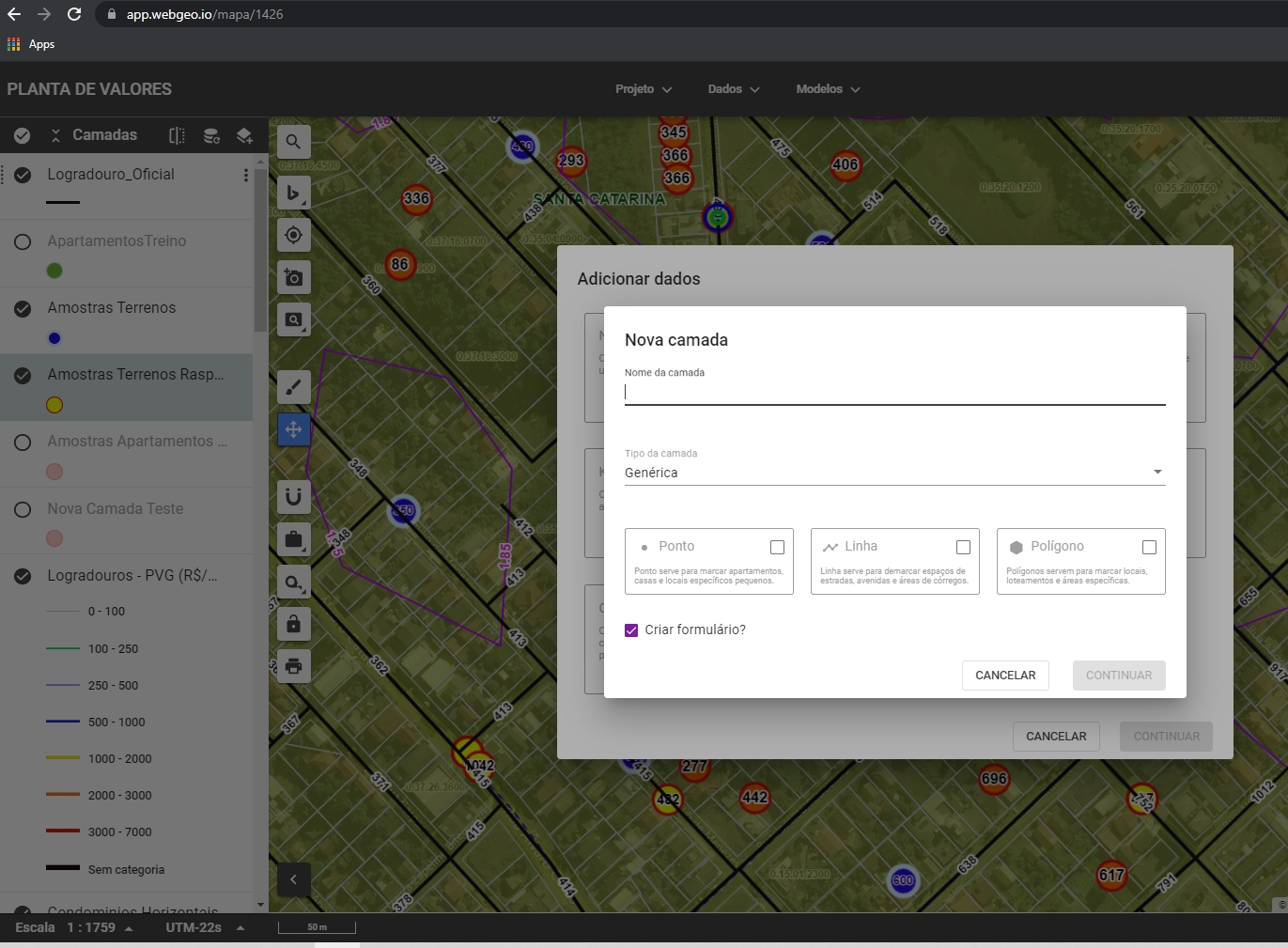 Acesse o webgeo online. Crie projetos e convide seu time. Crie camadas do tipo ponto, linha ou polígono e crie formulários dinâmicos